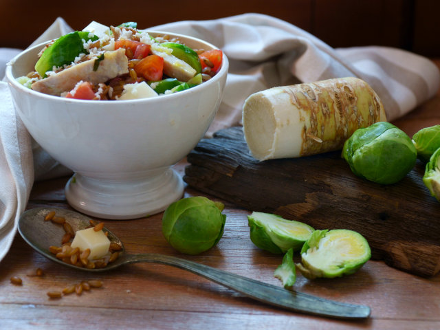 Segale in insalata con cavolini di Bruxelles, tacchino e rafano