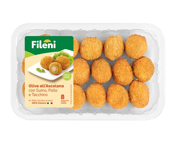Sie sind die regionale Spezialität der Marken, das Aushängeschild der Fileni-Produkte. Große, fleischige Oliven, fachmännisch gefüllt mit einer Füllung aus Hühner-, Puten- und Schweinefleisch, umhüllt von einer knusprigen, goldgelben Panade.
