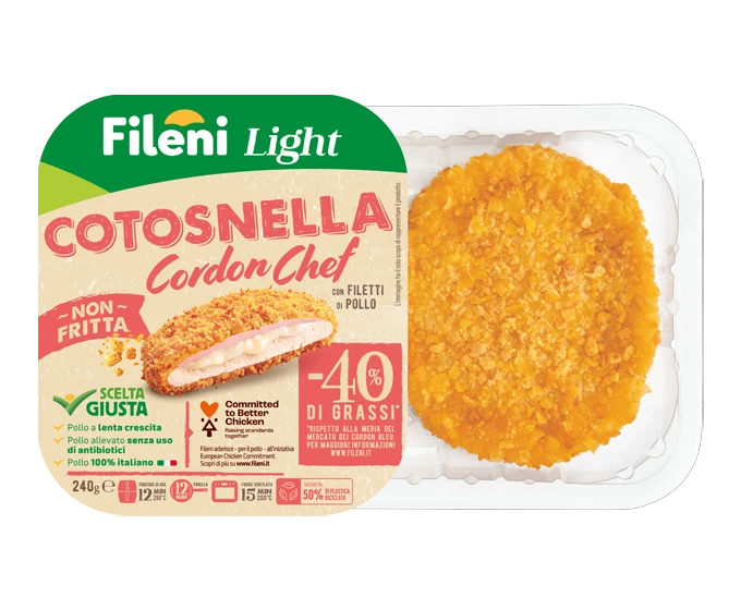 Croccante fuori, ma con un morbido cuore ripieno pronto a conquistare tutti. Scopri Cotosnella Cordon Chef Fileni: non fritta, con filetti di pollo 100% italiano, una panatura croccante e il 40% di grassi in meno rispetto alla media del mercato dei cordon bleu.