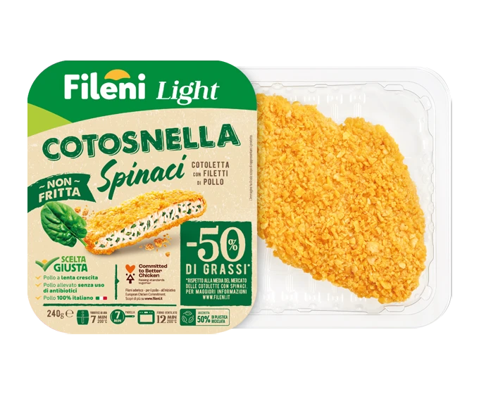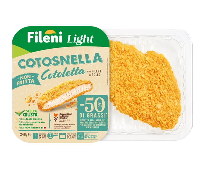 Tutto è partito da qui: dalla cotoletta Cotosnella, il primo panato Fileni Light. Scopri Cotosnella Fileni: non fritta, con filetti di pollo 100% italiano, una panatura croccante e il 50% di grassi in meno rispetto alla media del mercato delle cotolette.