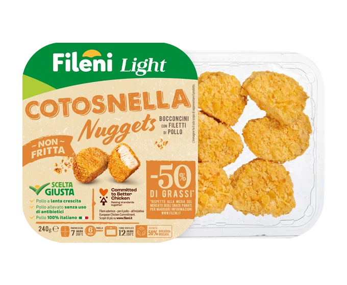 Una svolta così croccante, che di sicuro resterà nei libri di storia. Scopri i Cotosnella Nuggets Fileni: non fritti, con filetti di pollo 100% italiano, una croccante panatura e il 50% di grassi in meno rispetto alla media del mercato degli snack panati.