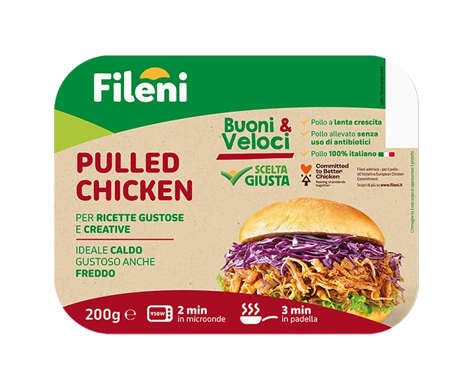 Da oggi, puoi! Con Pulled Chicken, la novità di casa Fileni. Già cotto e condito, preparato solo con pollo 100% italiano, allevato senza l’uso di antibiotici