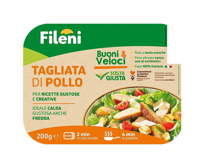 Sempre di corsa? Riprendi fiato! Da oggi, in cucina hai una marcia in più: arriva la nuova Tagliata di Pollo Fileni, fatta solo con delizioso pollo 100% italiano allevato senza l’uso di antibiotici. Già cotta, condita e tagliata: è sempre pronta per dare più sprint a tutte le tue ricette.