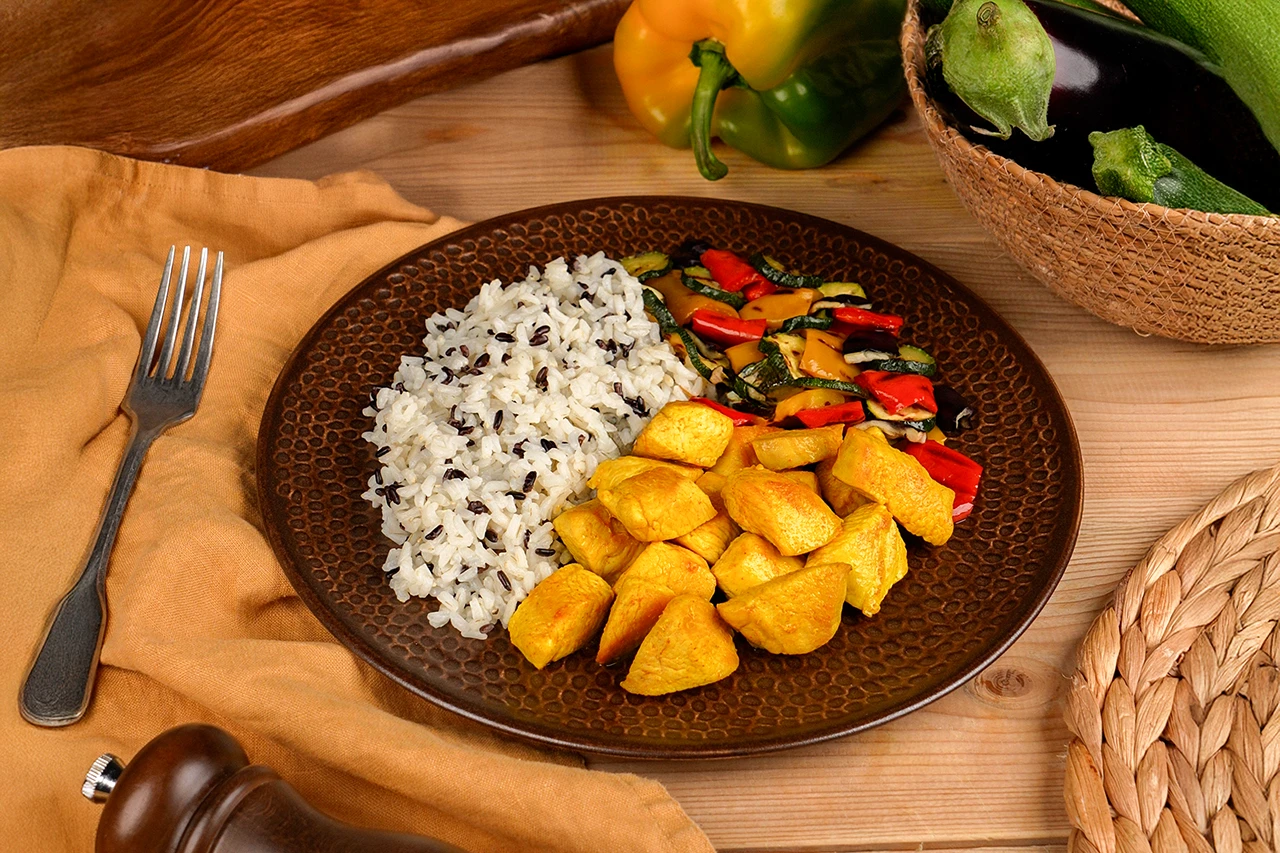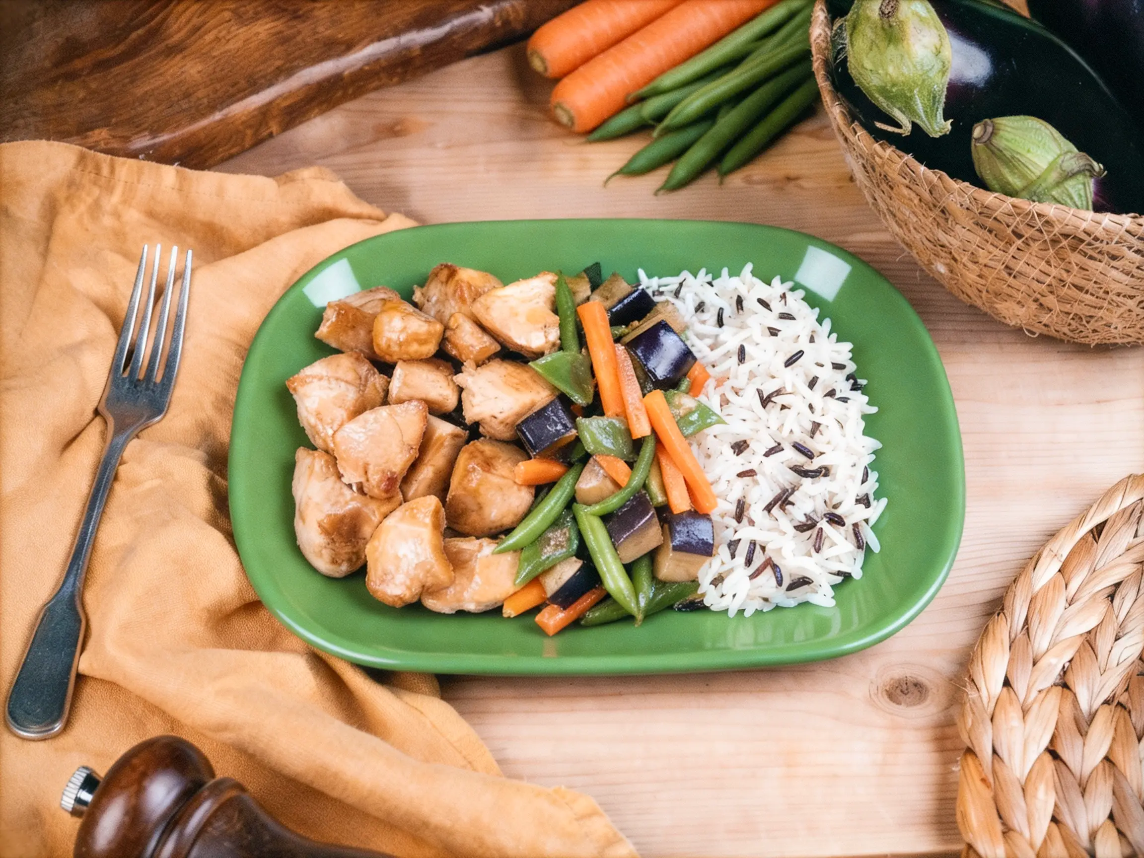 Oriental chicken, vegetable fantasy with basmati and black rice
