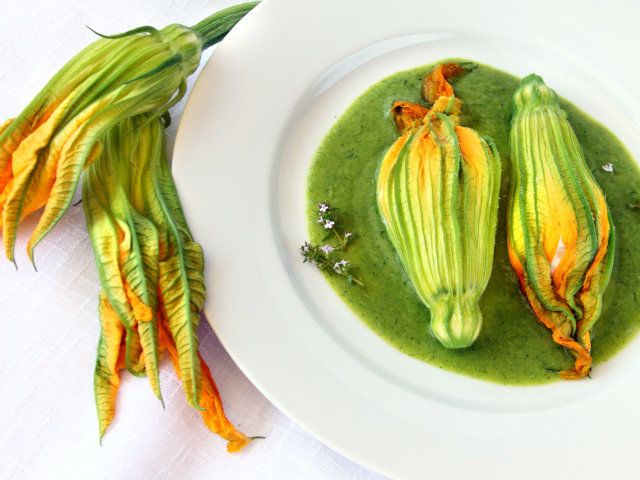 Fiori di zucca farciti con mousse di pollo alle erbe