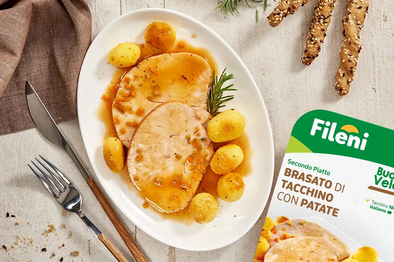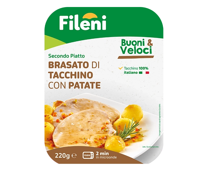Il brasato è preparato con la fesa di tacchino, cotto con vino bianco e accompagnato dalle migliori patate. Per tutte quelle occasioni in cui si ha poco tempo o poca voglia di cucinare, ma non si vuole rinunciare alla tradizione, al gusto e al sapore.