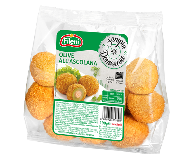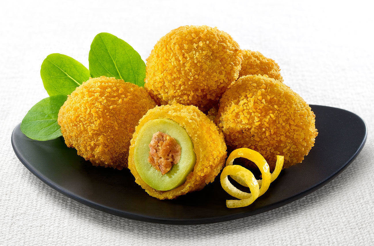 Grandi e polpose olive, sapientemente farcite con un ripieno di carne di pollo, tacchino e maiale, ricoperte da una panatura croccante e dorata.
