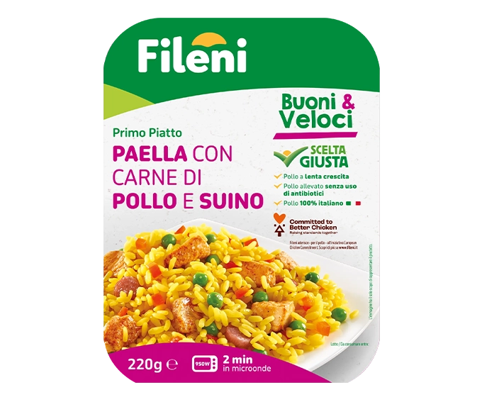 Dall’originale ricetta valenciana ecco in tavola la Paella con carne, un piatto unico, perfetto connubio tra tenerissime carni scelte, riso e verdure, il tutto condito con una squisita salsa di verdure aromatizzata con spezie.
