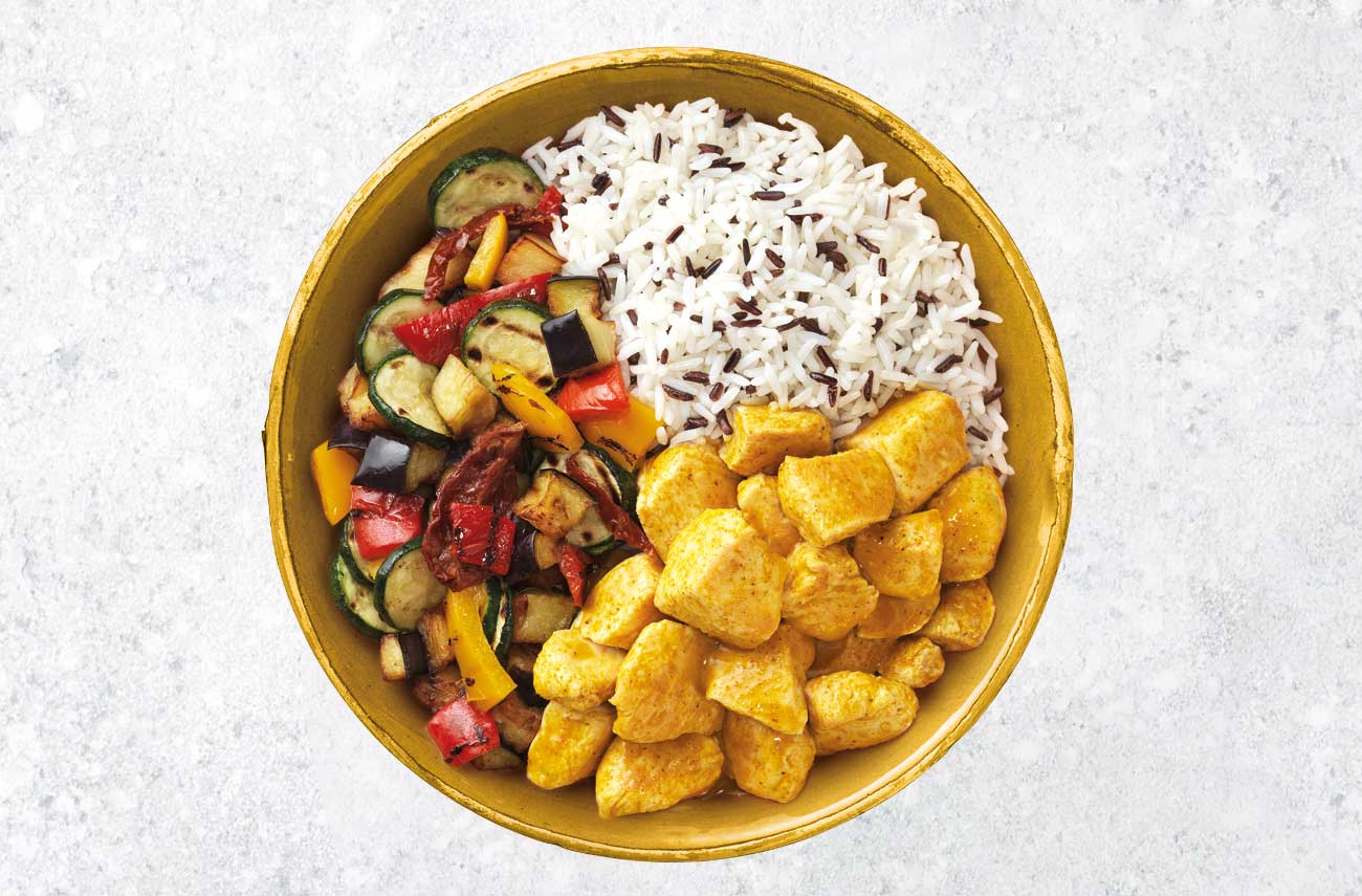 Questo sfizioso piatto pronto racchiude il giusto mix di ingredienti, in un piatto unico e completo: soffici bocconcini di pollo saporiti, accompagnati da riso ribe e verdure grigliate.
