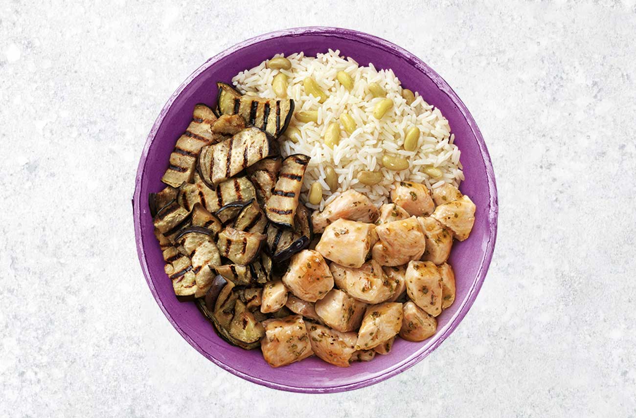 Questo sfizioso piatto pronto è la giusta risposta per un pasto nutriente senza rinunciare al gusto: una selezione di bocconcini di petto di pollo, con un tocco di erbe provenzali, insieme a melanzane, fagioli verdi e riso ribe.