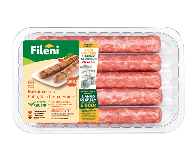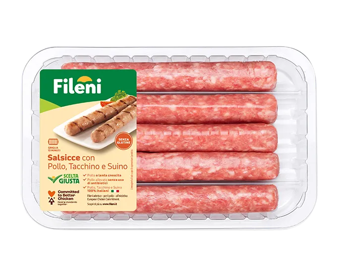 Stuzzicante mix di pollo, tacchino e suino. Le salsicce Fileni non rinunciano al gusto e sono senza glutine!