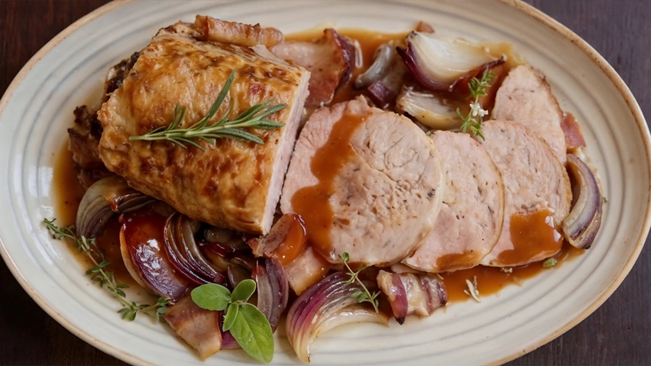 Tagliare l’arrosto a fette non troppo sottili e servirlo accompagnato dalle cipolle caramellate, dal bacon croccante e irrorato generosamente con il sughetto di cottura.